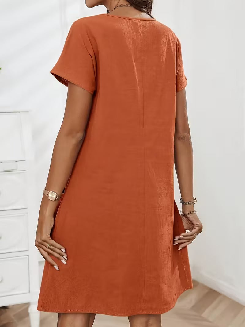 This short-sleeve dress blends clean structure with everyday ease. With button detailing, pockets, and a flattering A-line shape, it transitions effortlessly from casual to semi-formal occasions.