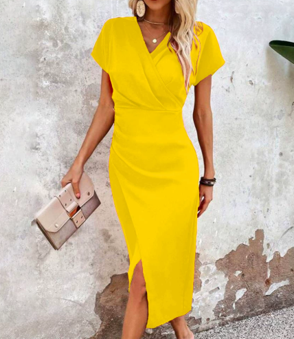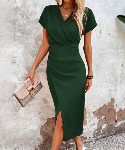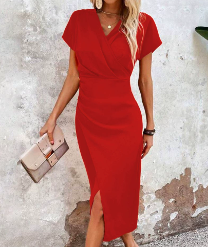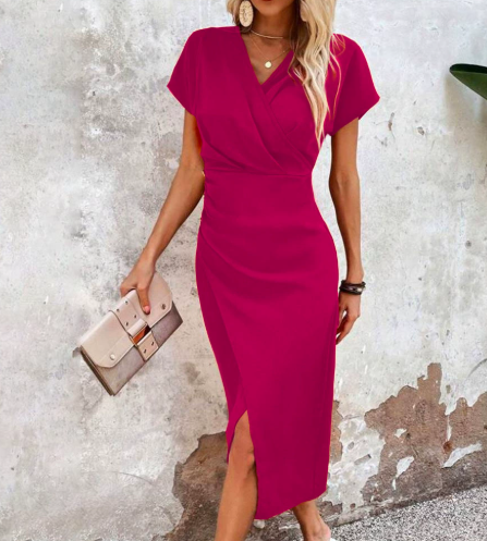 Designed with clean lines and subtle detail, this midi dress offers an elegant silhouette that moves easily from day to evening. Its refined V-neck and front split bring quiet sophistication to every occasion.