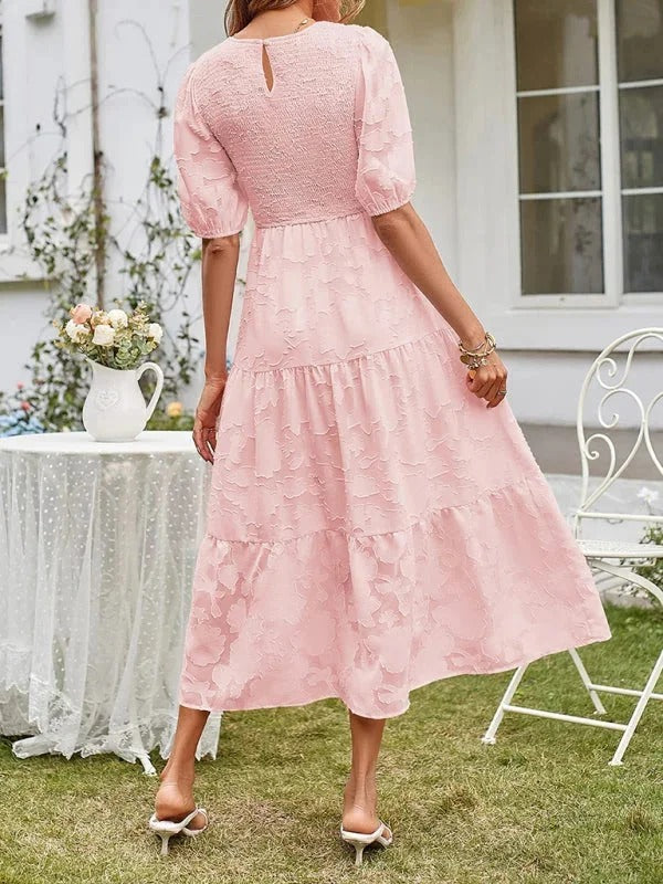 Soft texture and flowing tiers define this effortlessly elegant midi dress. Designed to move with ease, its floral detailing and flattering fit offer a refined yet relaxed aesthetic for day-to-evening wear.
