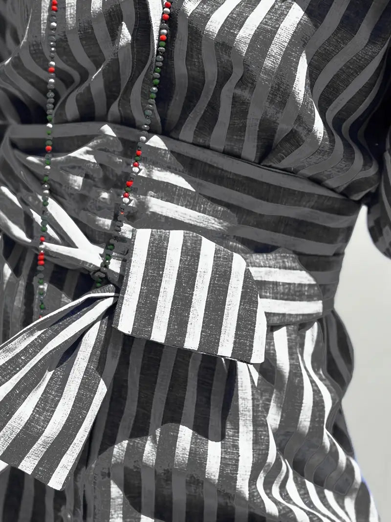 Defined by sharp vertical stripes and structured tailoring, this long shirtdress blends crisp detail with flowing ease. Designed to shift from formal to casual with a simple change in styling.
