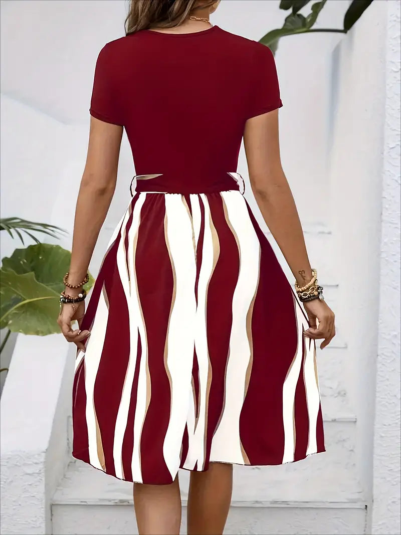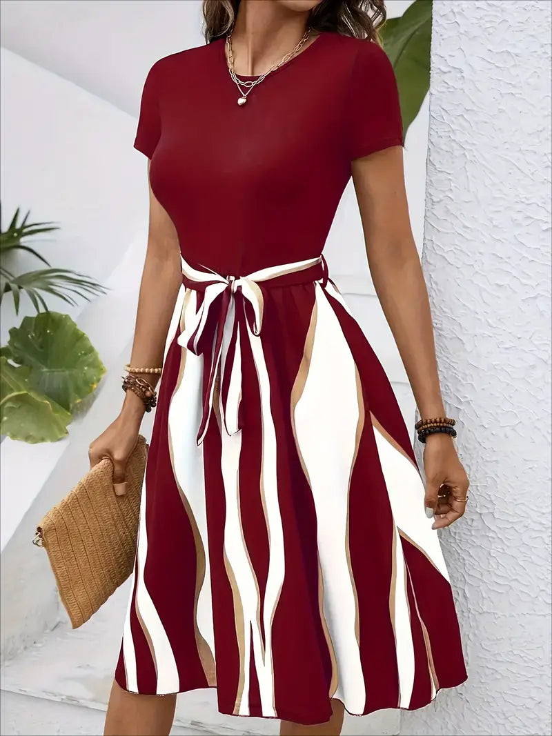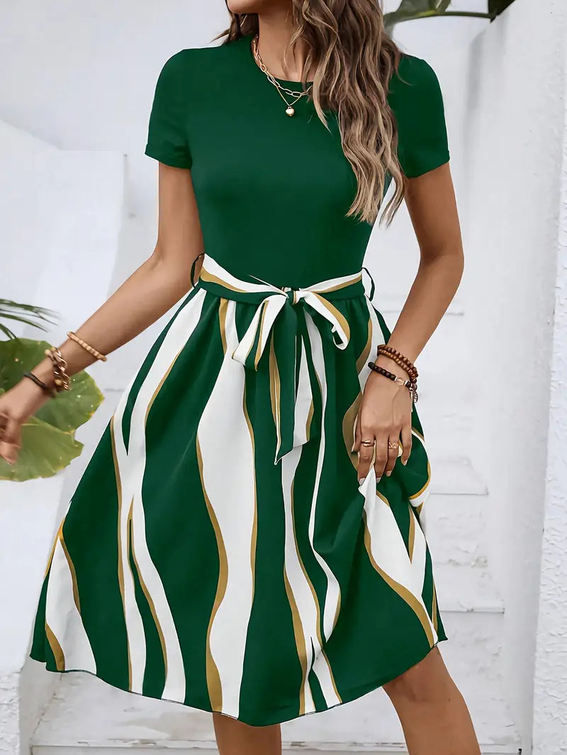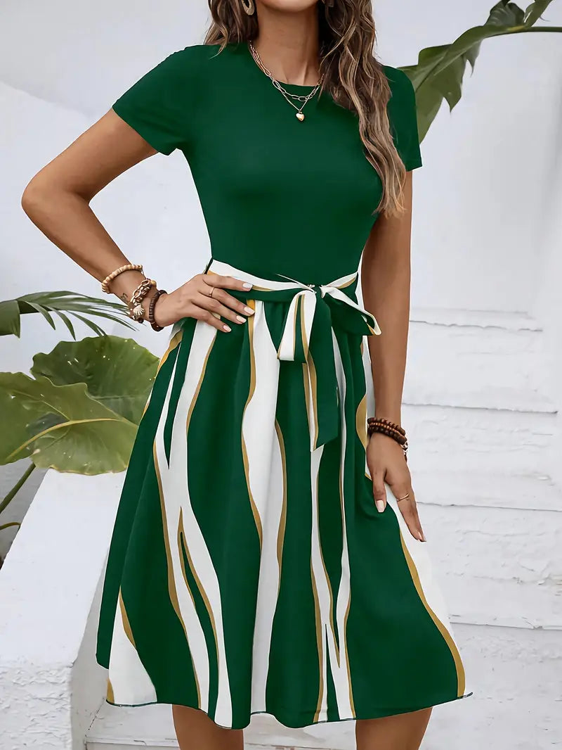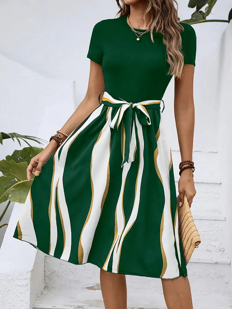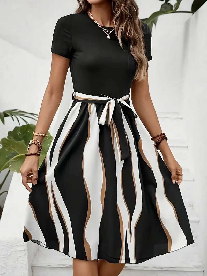 A timeless A-line dress with a flattering crew neckline and a softly draped belt. The gently flowing shape and subtle stretch create an elegant silhouette for day or evening wear.