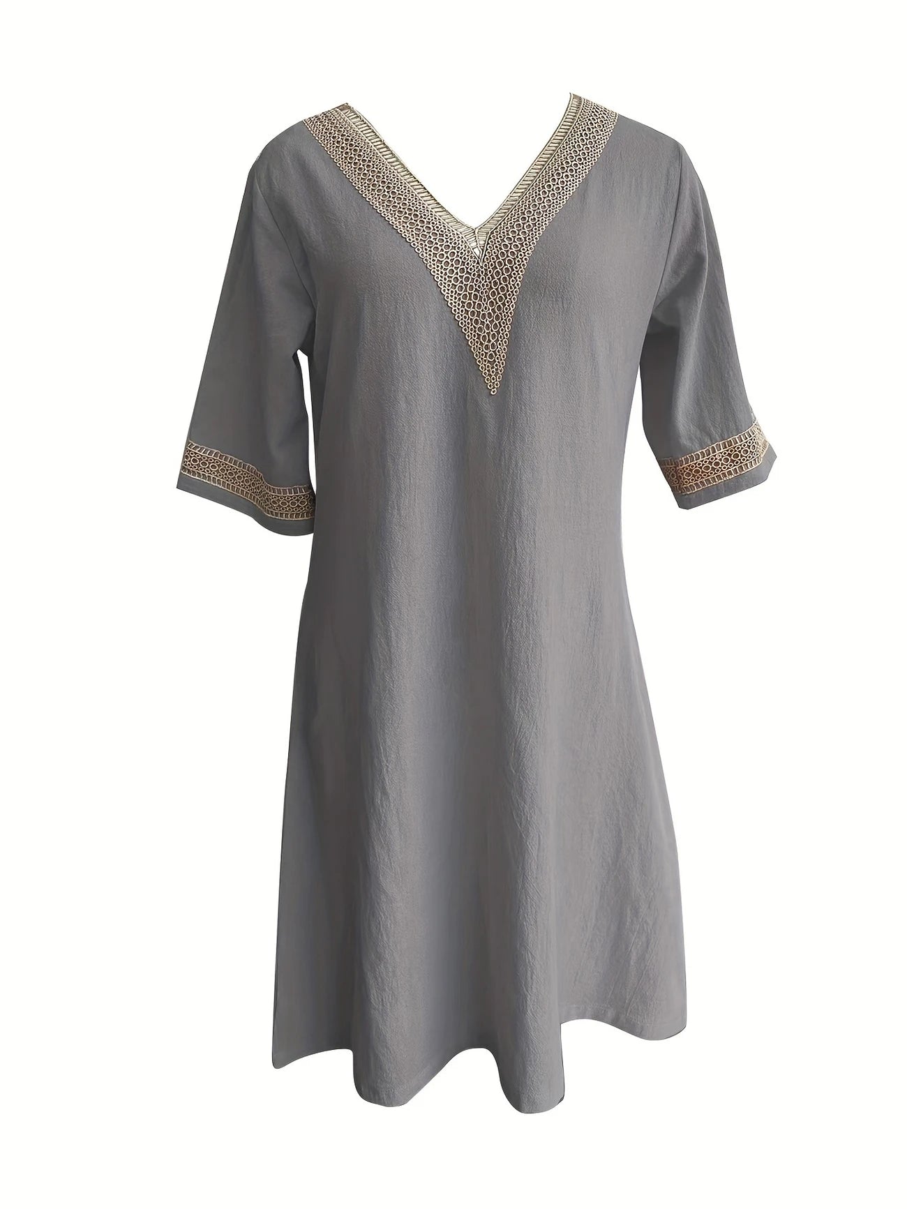 This knee-length tunic dress offers casual elegance with thoughtful detailing. Featuring a V-neckline and subtle hollow accents, it’s designed for effortless wear and everyday versatility.
