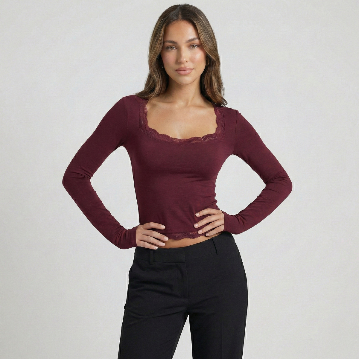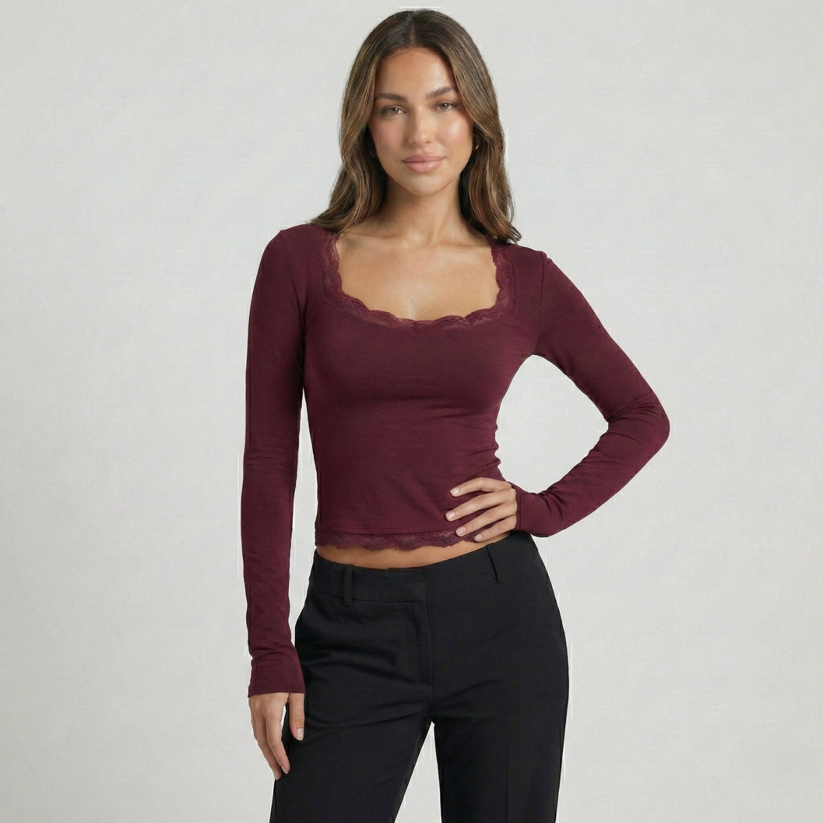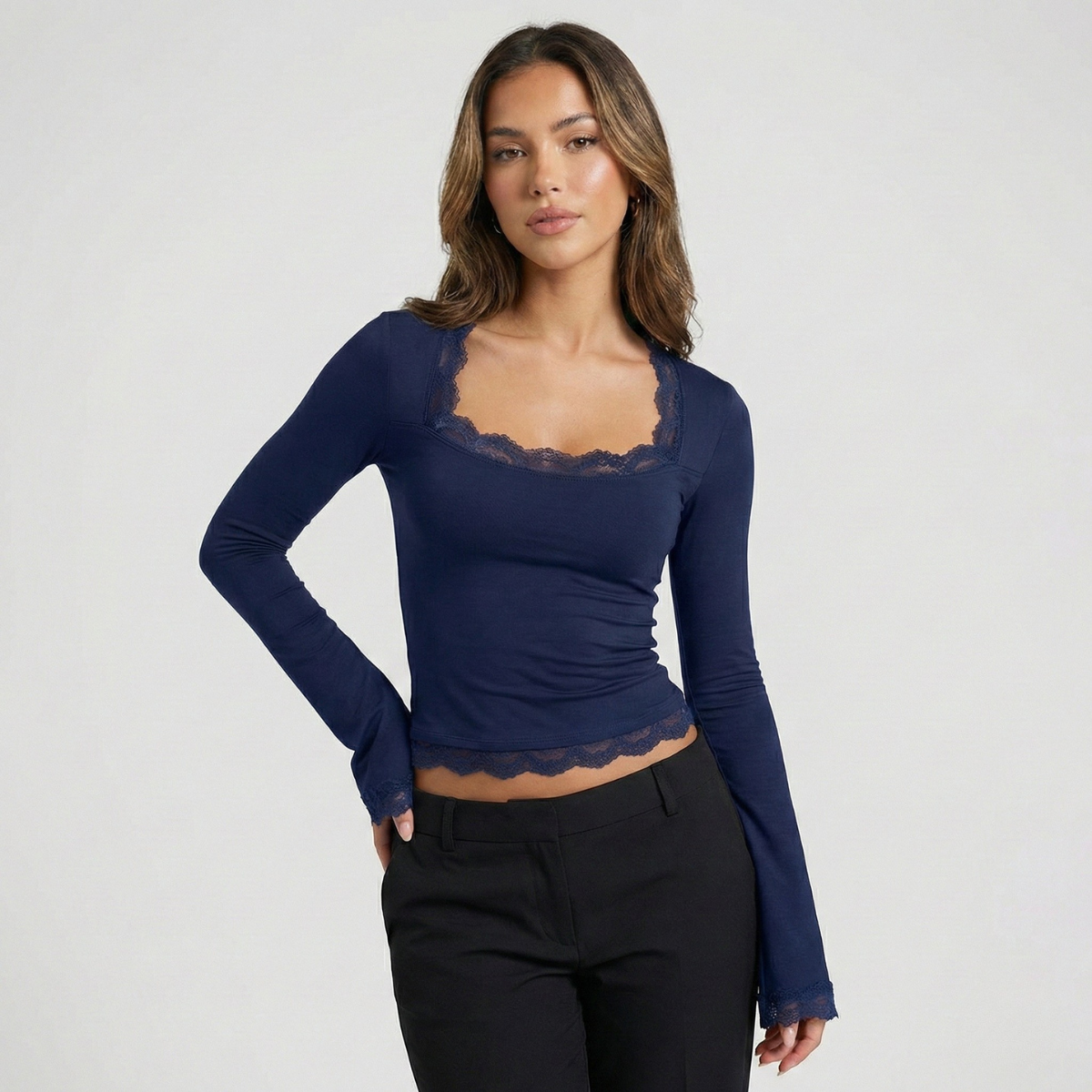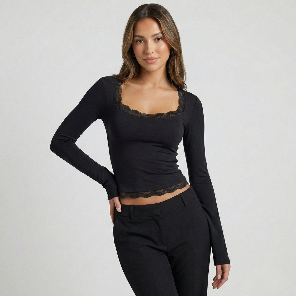 Step into subtle elegance with this long sleeve lace-trimmed top, blending vintage charm with a modern silhouette. Designed to flatter and captivate, it’s the perfect piece for elevated everyday looks or dressed-up evenings out.