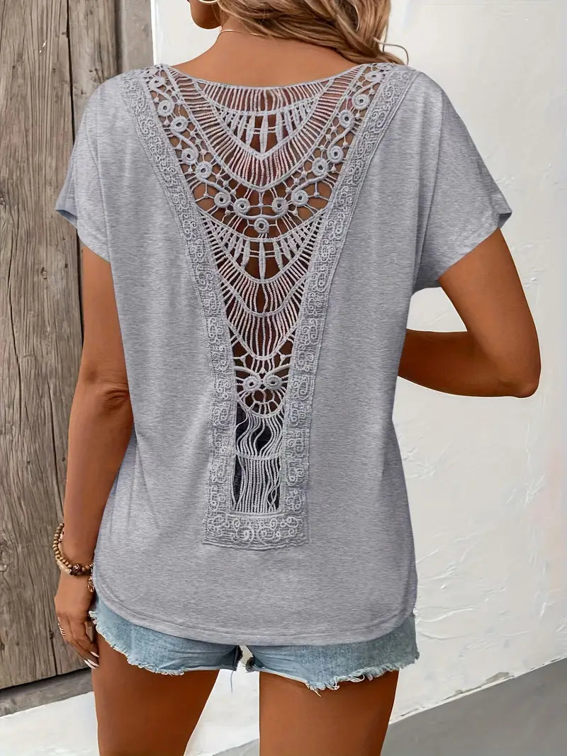 Lace trim accents – Adds texture and a refined touch to the neckline and sleeves