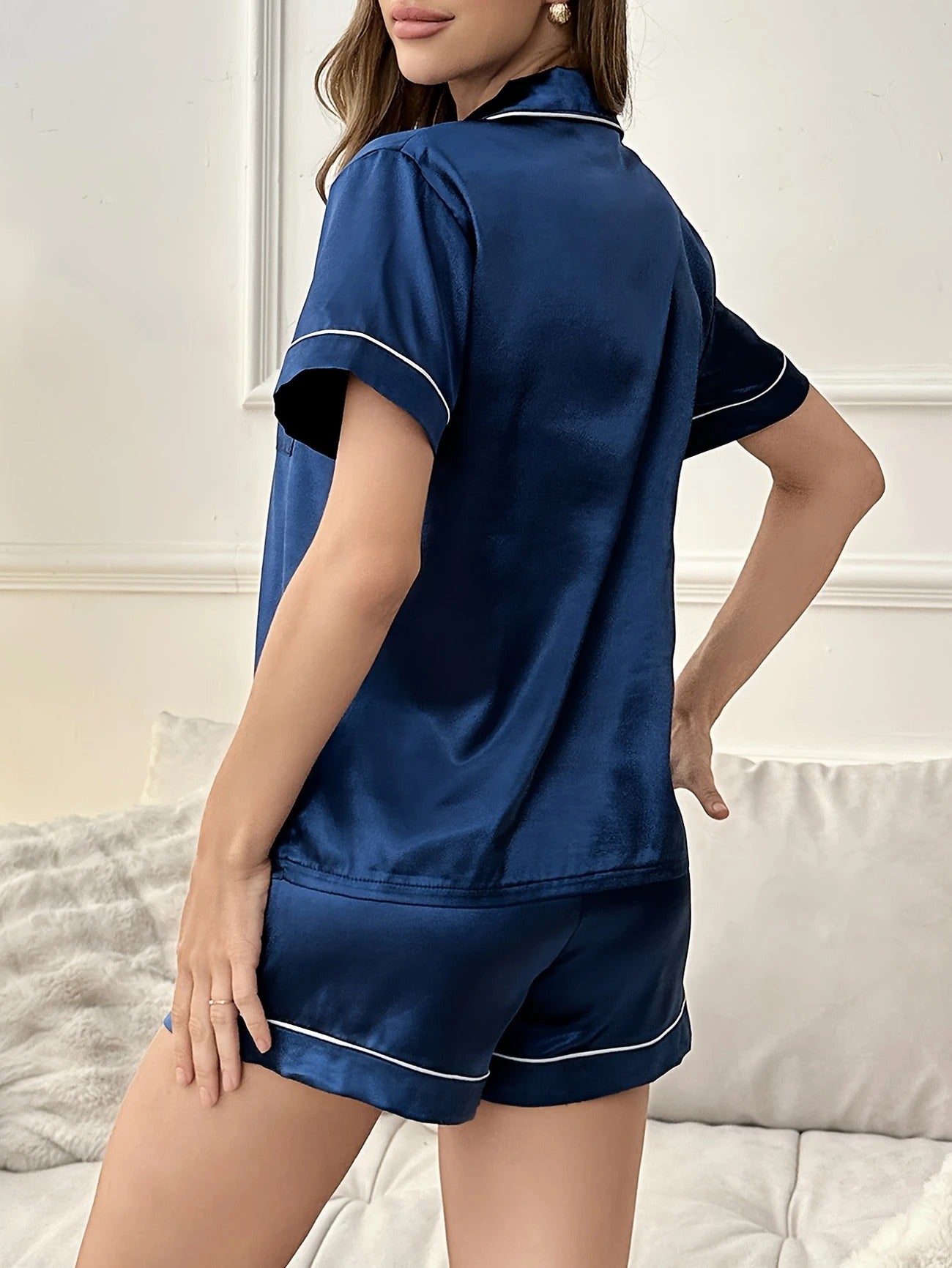 Smooth satin meets simple design in this refined pajama set. Tailored with a relaxed silhouette and subtle stretch, it’s made for quiet moments and easy movement.