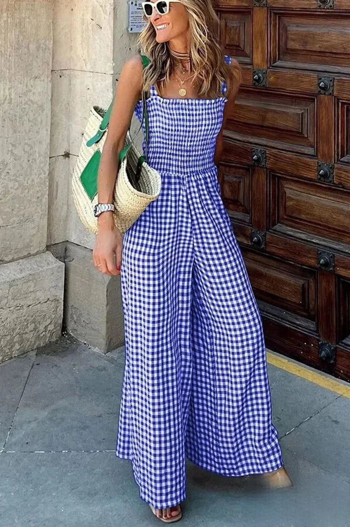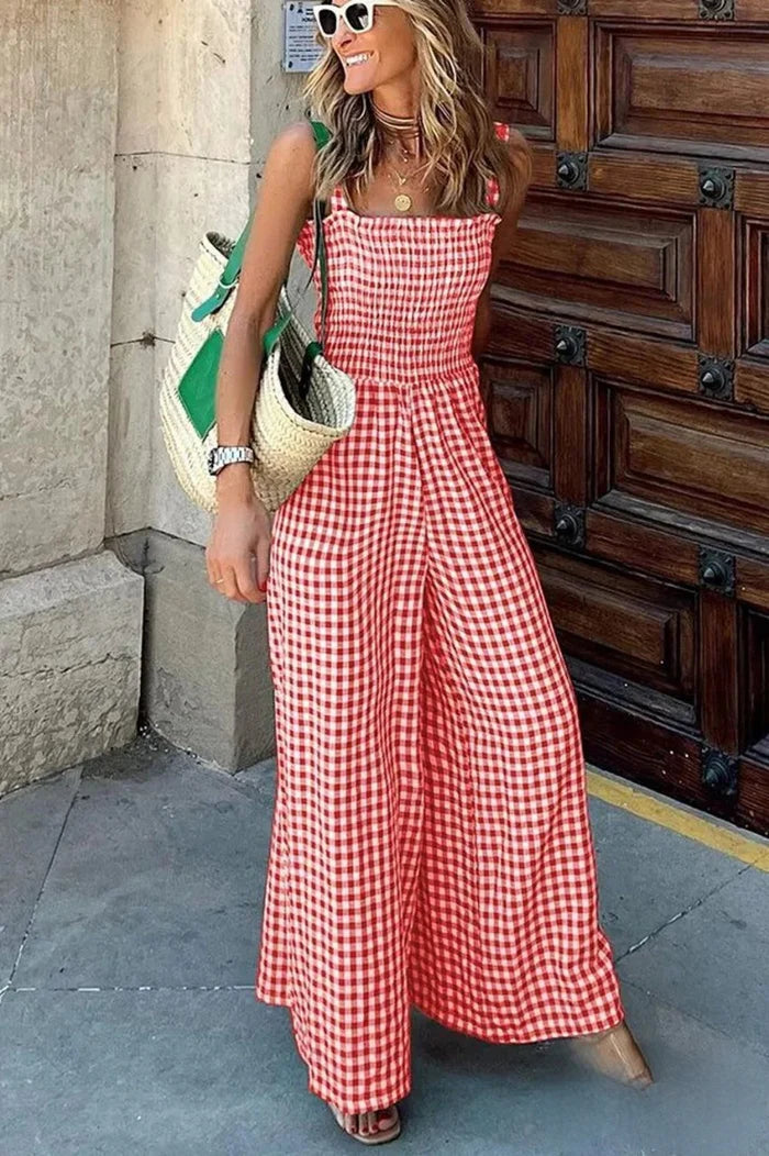 With its wide-leg shape and gathered detail, this check-print jumpsuit blends relaxed style with structured charm. The flattering fit and soft drape make it a standout choice for elevating everyday looks or dressing up with ease.