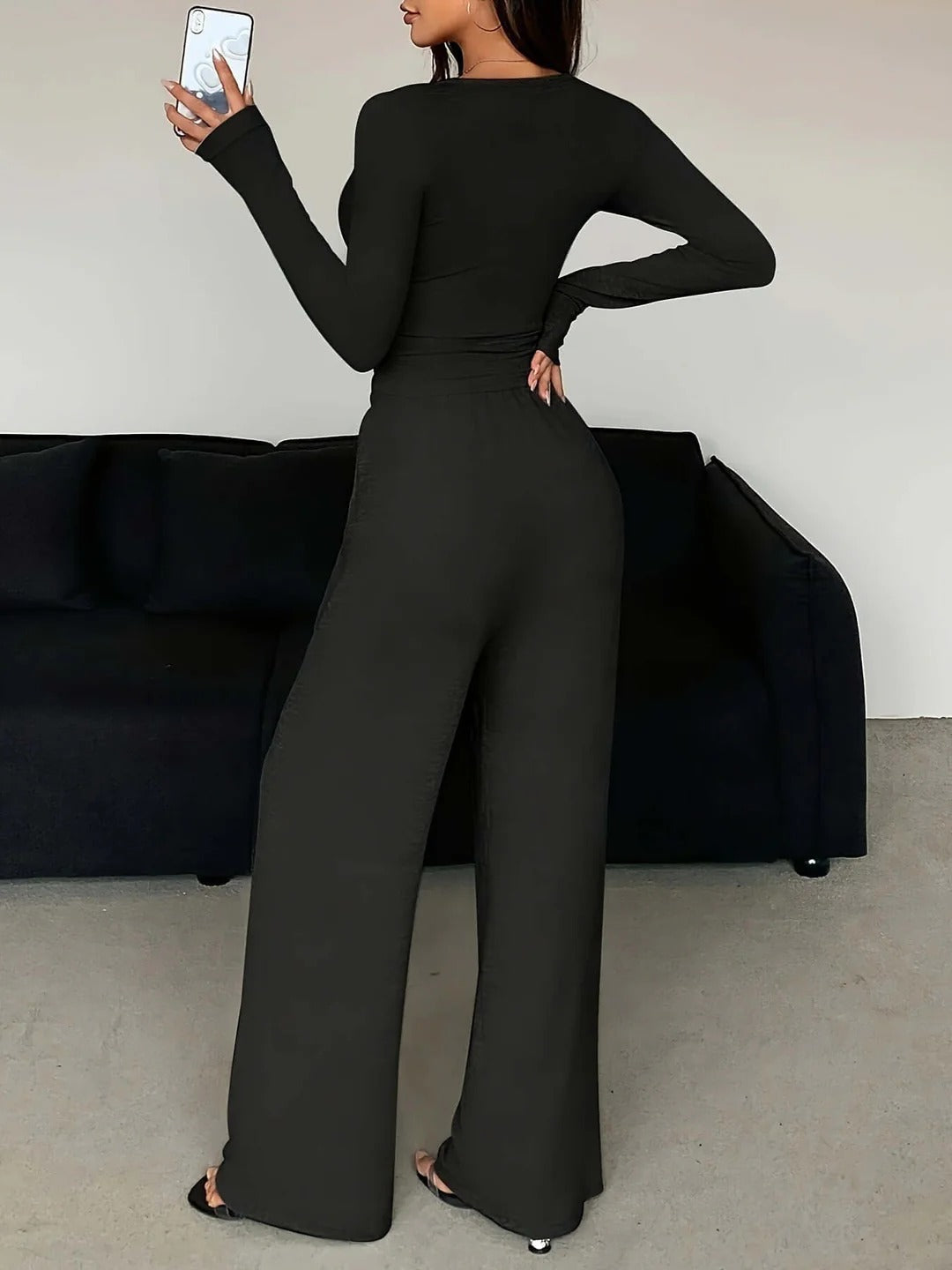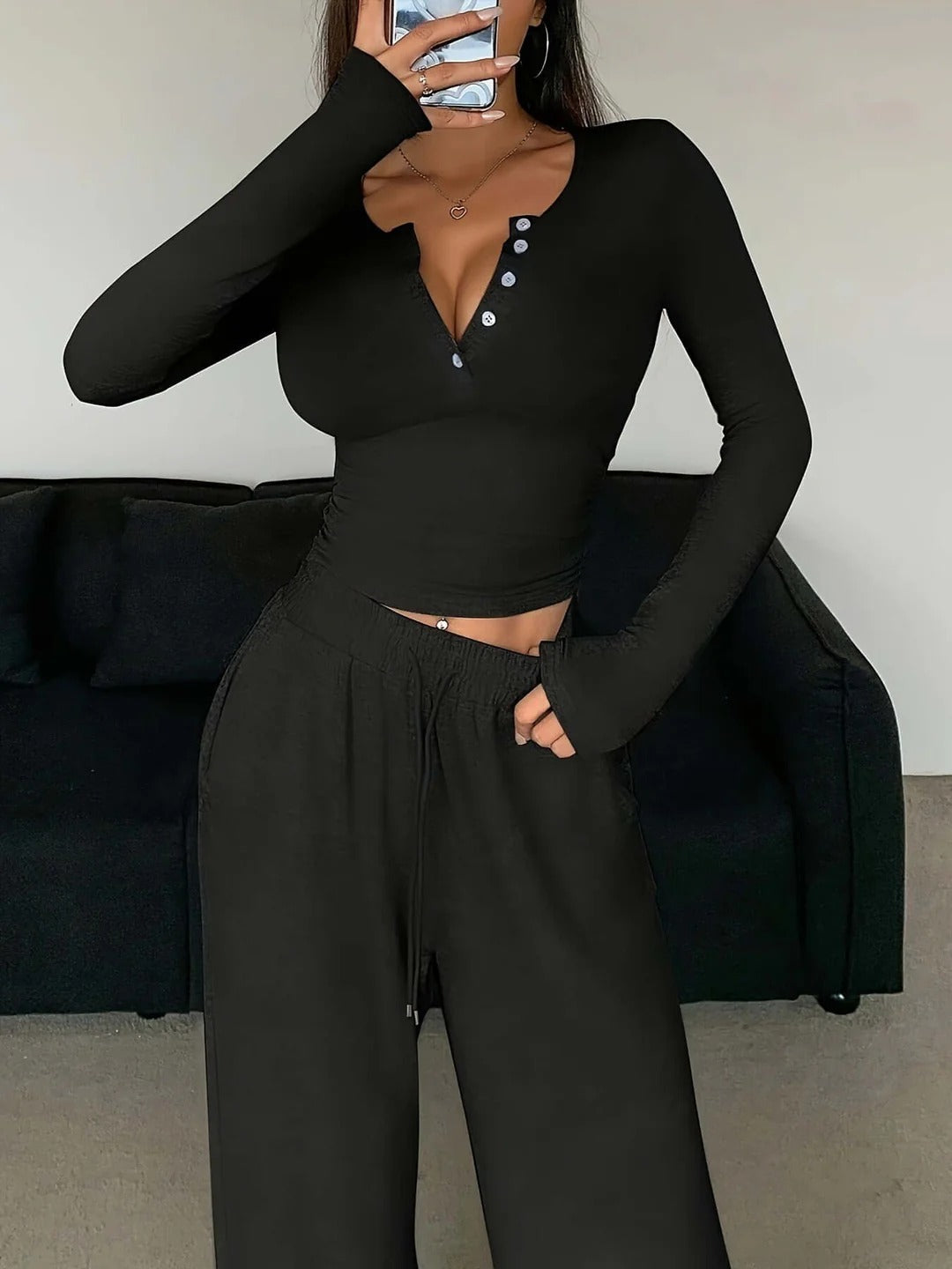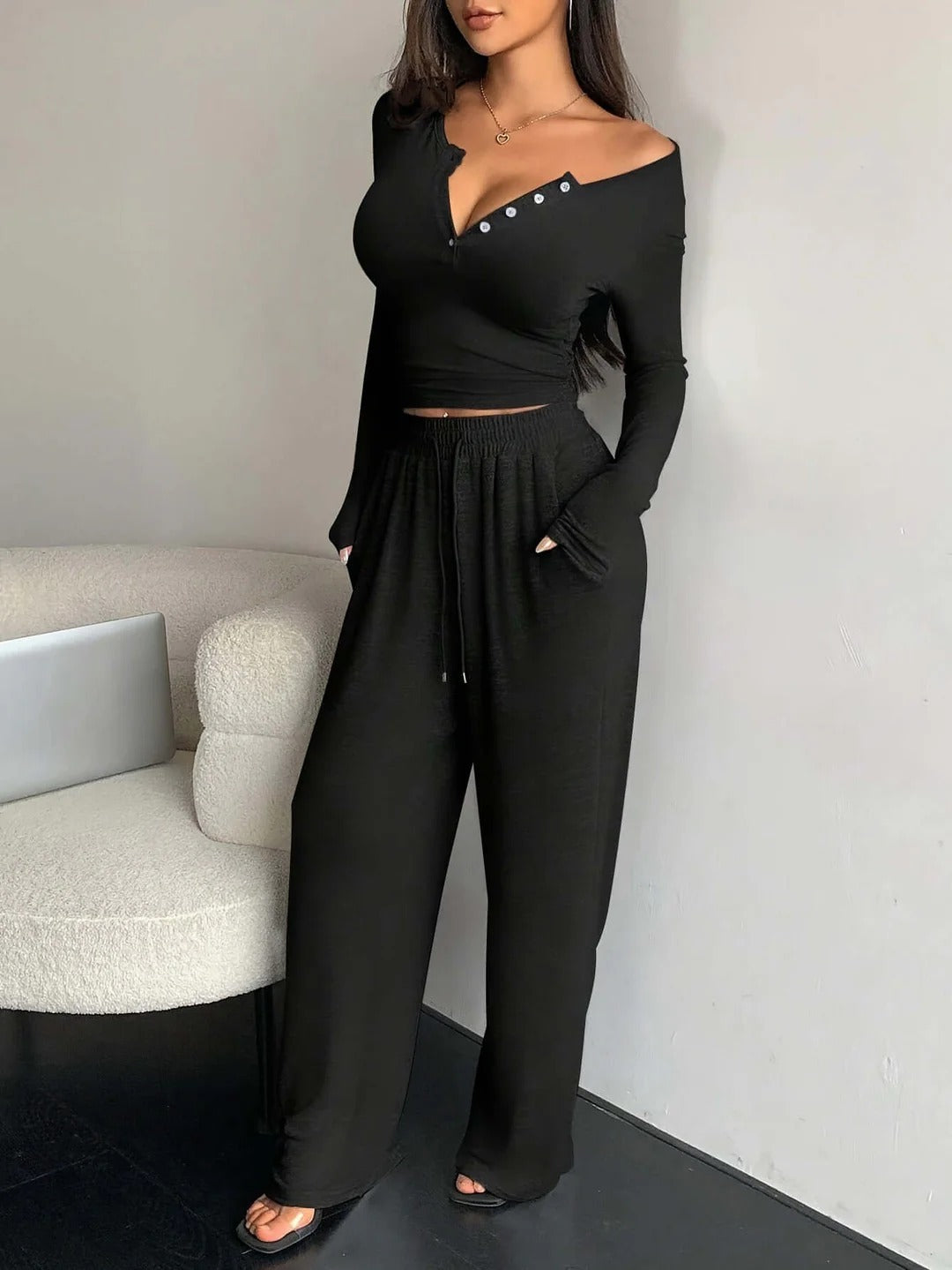 Relaxed two-piece design – Includes a button-down top and wide-leg pants