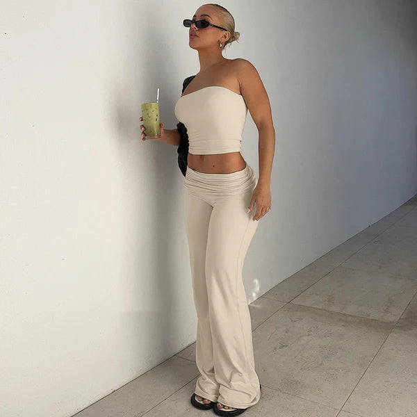 Turn heads with this sleek and stylish two-piece outfit. Designed for comfort and elegance, this set features a strapless crop top and high-waisted, draped pants that flatter your silhouette. Perfect for casual outings, vacations, or a night out, this effortlessly chic ensemble makes dressing up easy.